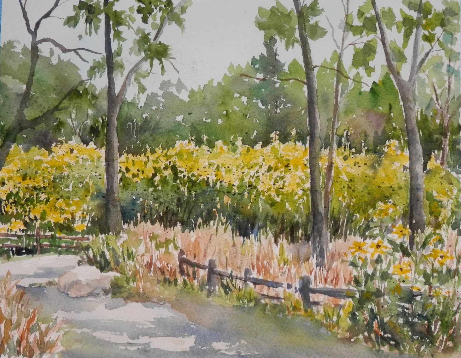 This is beautiful Joan! I love the way the fence introduces a horizontal break in the foliage. Gorgeous greens and I love your brushwork!