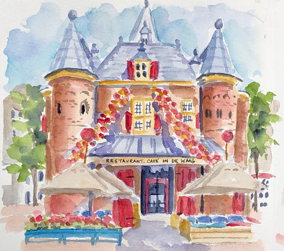 Anyway there was a very nice square in Amsterdam called Nieuwmarket. Most days there were food trucks and vendors so shopping was fun. On Suzala's last day we headed over there only to find that the market area was being used for part of Amsterdam's Gay Pride Celebrations. They were bringing in beer trucks, constructing a stage and there were workmen all over. We decided to sketch there and since it started to drizzle we tucked ourselves under an overhang from one of the beer stands. This building looked so festive with all the pink, white and yellow balloons. It sort of looks like a Disney castle.