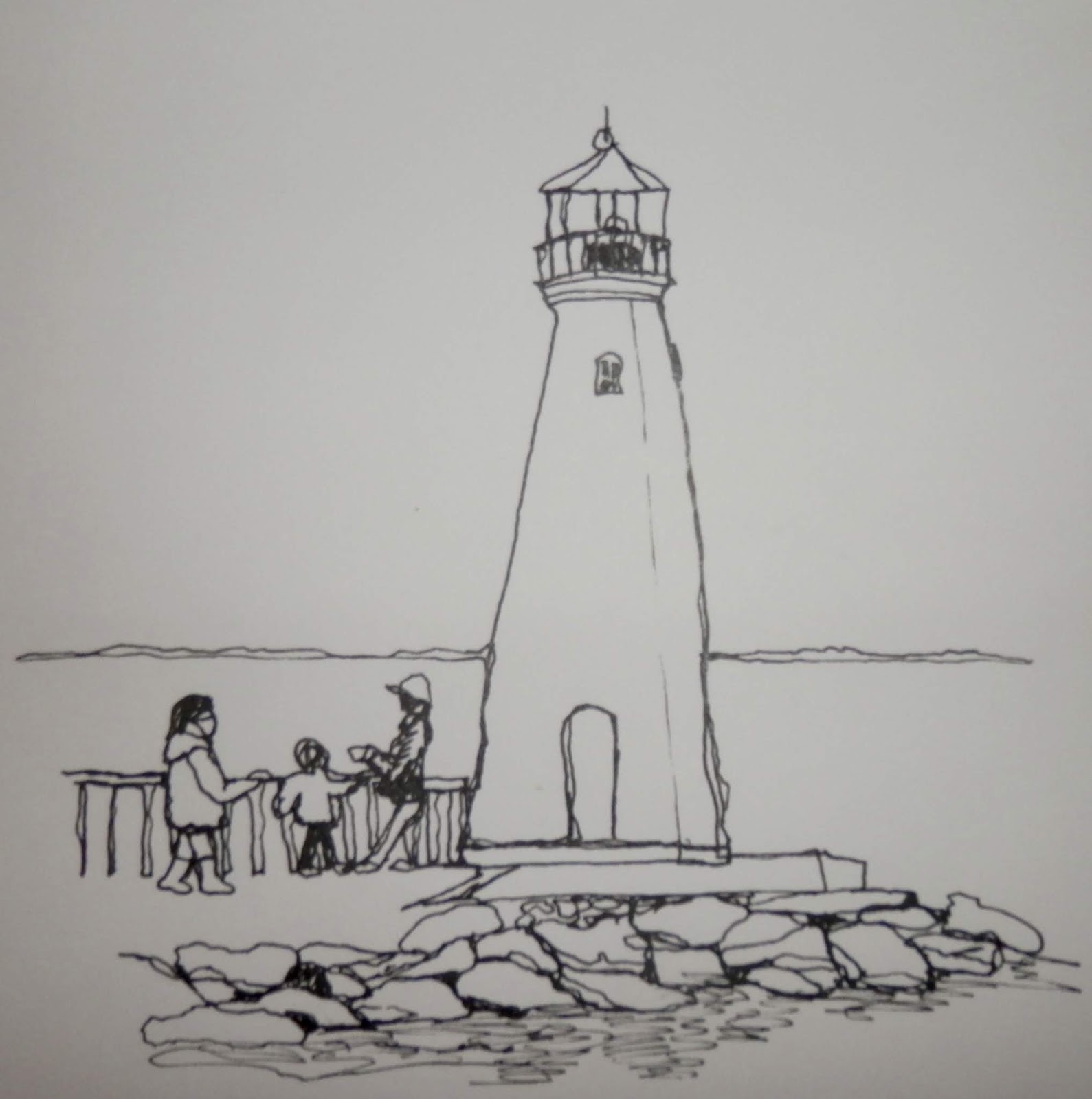 Yesterday I was in Patchogue buying a few things that I needed before Jerry comes home. While I was there I went down to Sandpit Marina and did a continuous line sketch of the little lighthouse and some people. I haven't done a continuous line in a long time, but it was fun to do.