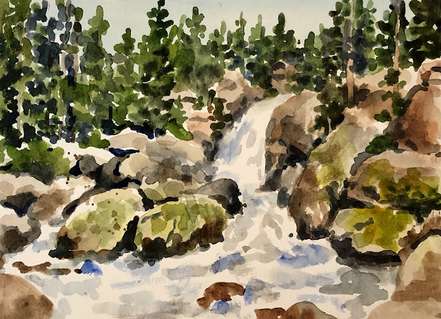 On Saturday the NYC Urban Sketchers virtually visited the Rocky Mountains. The trip was organized and designed by Mama Bear and Reggie Greeley and the website of wonderful information was provided by Cecelia Evanesco. Mama Bear and Reggie live in Colorado and their enthusiasm for their area showed. I decided to use one of the waterfall references and since I am taking part in the 30x30 Direct Watercolor Challenge I did this without any pencil lines.