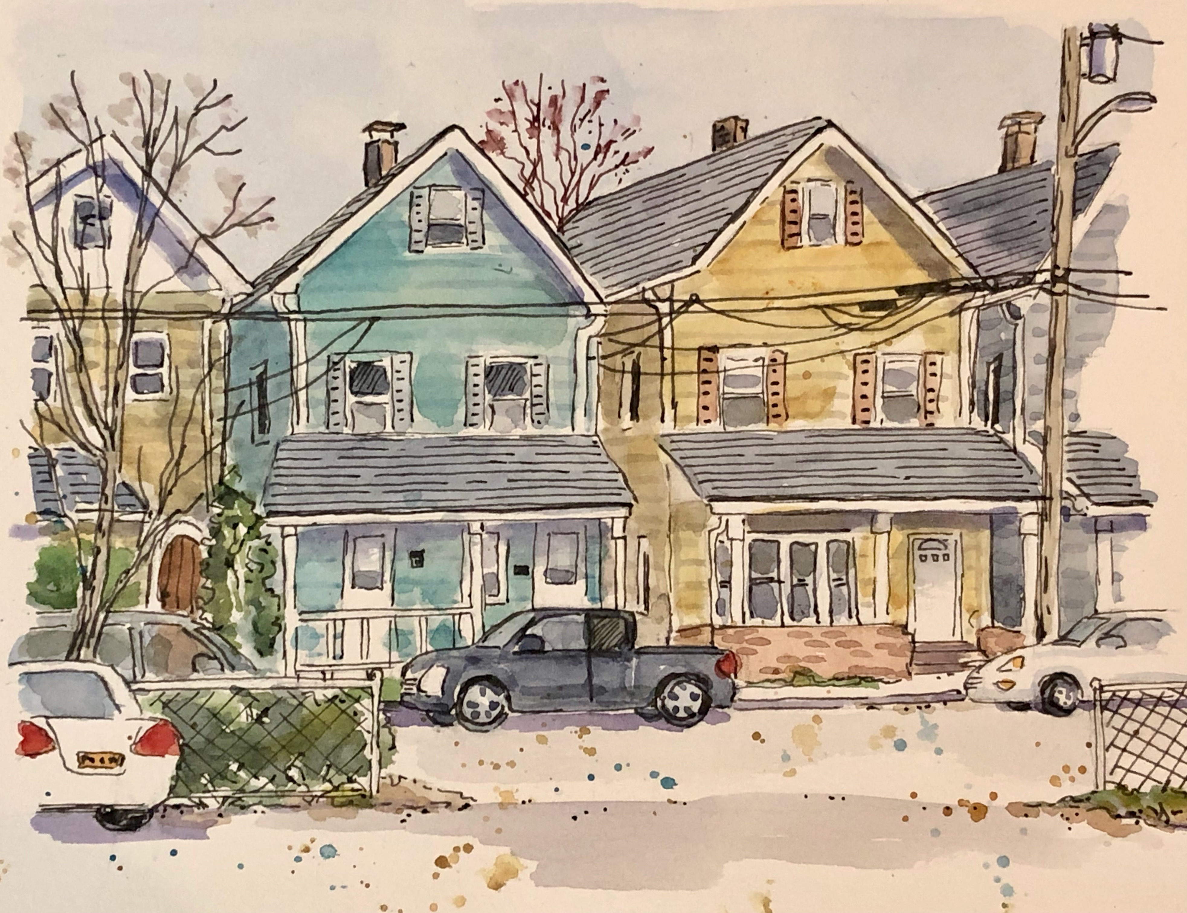 Why sketch one house if I can do two and 2 halves? This was sketched in Oyster Bay. I liked the row of houses and couldn't decide which one to sketch. I started sketching the yellow one and I slowly added a second and they looked like they needed a bit more company on the sides.