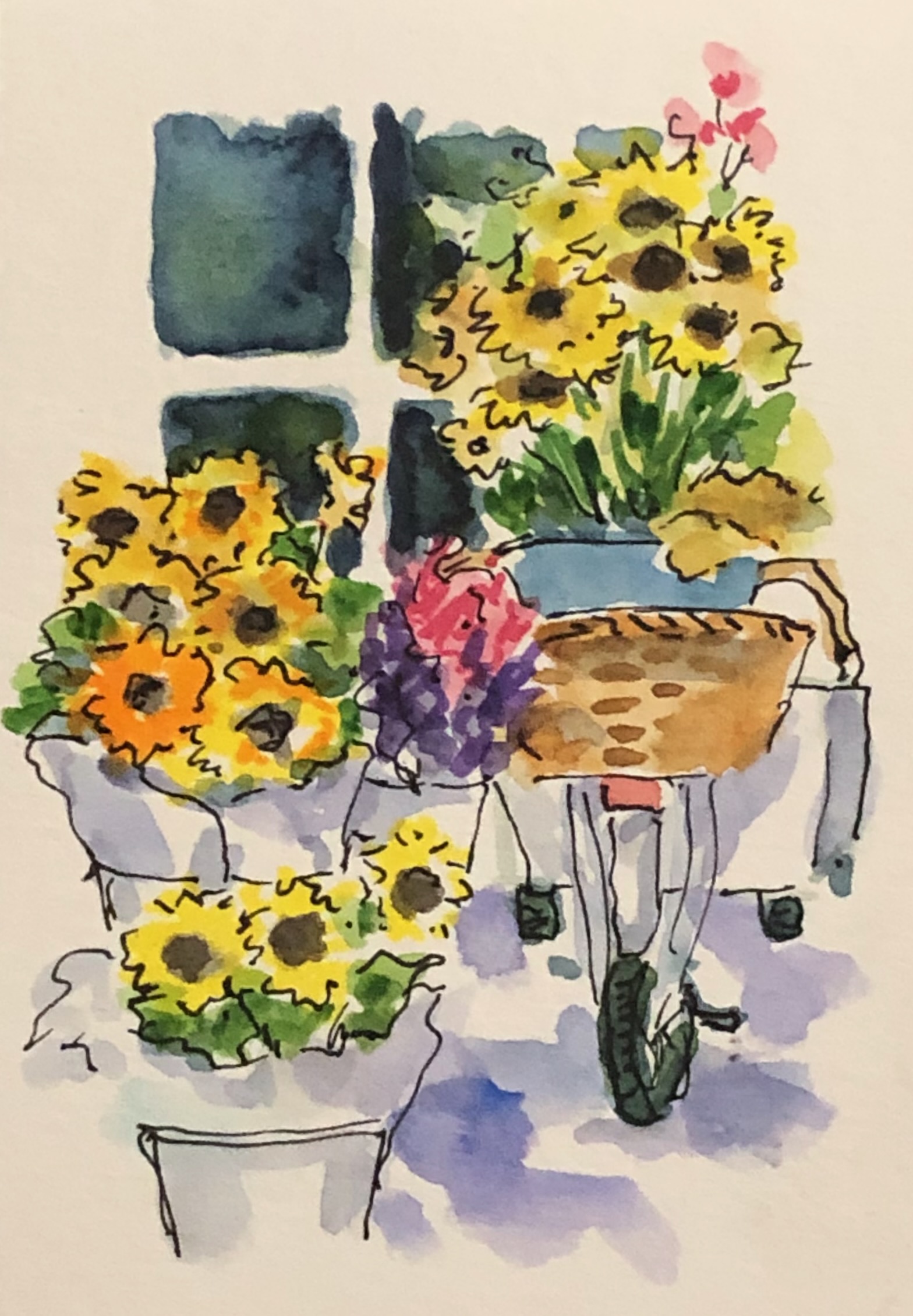 When I went to Bellport Day on Saturday I checked in with at the South Bay table and the submitted artwork. Then I went off to find something to sketch. Outside Bellport Central there was a great display of sunflowers for sale...some in containers and some in a bicycle basket. I started directly with watercolor and only had a bit of the flowers on left done when someone took them inside. I figured the ones in the bicycle basket would be next so I painted quickly. Sure enough that display disappeared too. That is one of the perils of plein air...the subjects often disappear.
