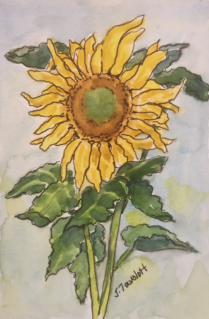 I have continued doing some sunflowers for the postcard project being organized by my friend, MaryJo Ernst who is a fellow Urban Sketcher who lives in Michigan. The project is being done to send the postcards to Ukraine in support. I have tried to vary the design and sometimes the medium I've used for the postcards. This one was done with watercolors and ink.